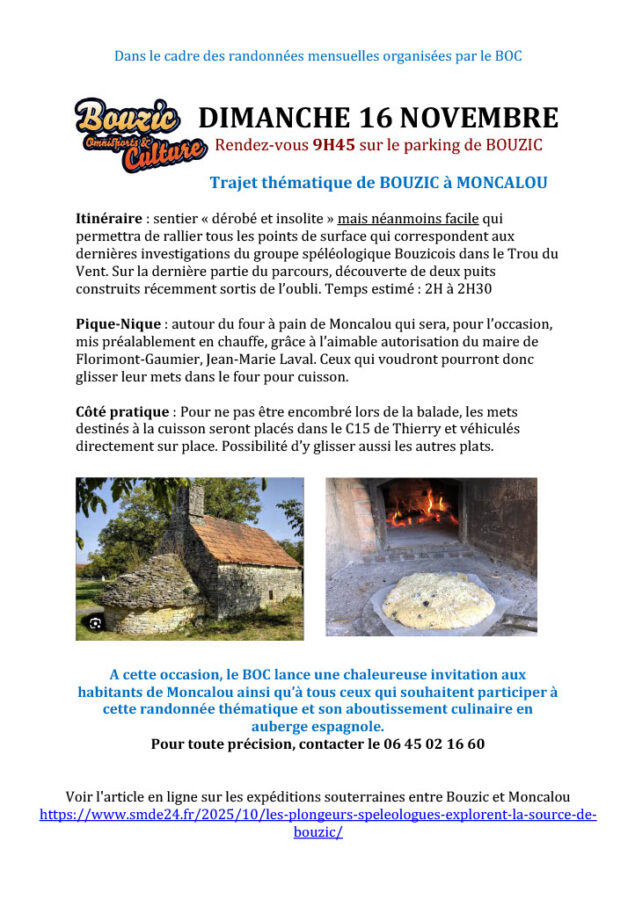 Trajet thématique de BOUZIC à MONCALOU, qui permettra de rallier tous les points de surface qui correspondent aux dernières investigations du groupe spéléologique Bouzicois dans le Trou du Vent suivi d’un pique-nique façon auberge espagnole autour du four de Moncalou, qui sera en chauffe pour l’occasion.